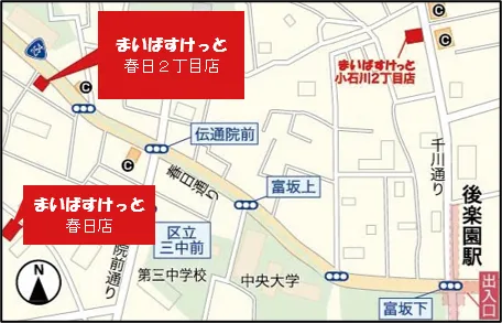 3月25日(月) 8:00~臨時休業期間中は、「まいばすけっと春日2丁目店」の近隣の、「まいばすけっと春日店」をご利用いただけますと幸いです。【まいばすけっと春日店】所在地 :東京都文京区水道1-11-9ハイネス小石川電話番号 :03-5805-9322営業時間 :7:00~24:00