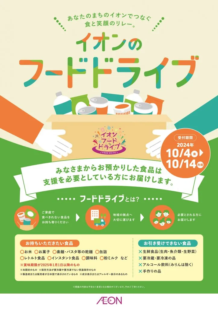 イオンは10月の「食品ロス削減月間」に合わせ、10月4日(金)から14日(月・祝)までの11日間、全国のグループ16社 約2,000店舗にて、フードドライブを実施します。
