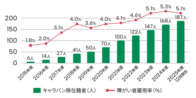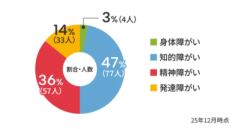 2025年9月現在、180名以上の方が在籍しており、障がい種別は、身体・知的・精神・発達とすべての属性の方が活躍しています。