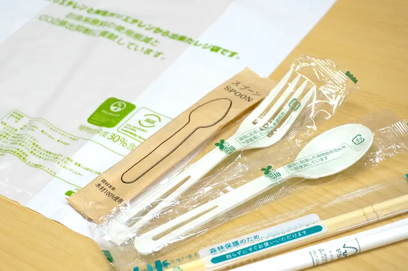 店舗で提供しているレジ袋は、生物の光合成による有機物であるバイオマス(植物由来)の素材を30%配合した製品を使用し、また、カトラリーにおいても、廃プラスチック削減に努めています。